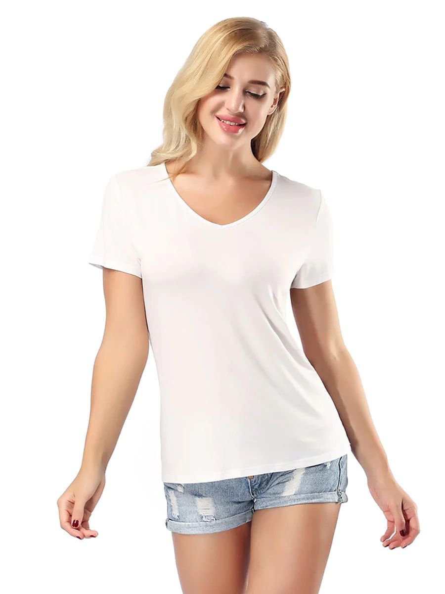 A classic short-sleeve V-neck tee designed for a flattering, comfortable fit. Made from soft, breathable fabric with a smooth feel, this wardrobe essential pairs effortlessly with jeans, shorts, or skirts for clean, casual style you can wear anywhere.